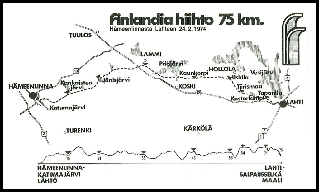 The first Finlandia-hiihto from Hämeenlinna to Hyvinkää in 1973 was cancelled due to poor snow cover. The first completed Finlandia-hiihto in 1974 was skied from the ice of Lake Katumajärvi in Hämeenlinna to the ski stadium in Lahti on a 75 km route. A premature shot from the starting gun sent the eager skiers on their way in sunny weather, in the middle of a speech by Province Governor Valdemar Sandelin.